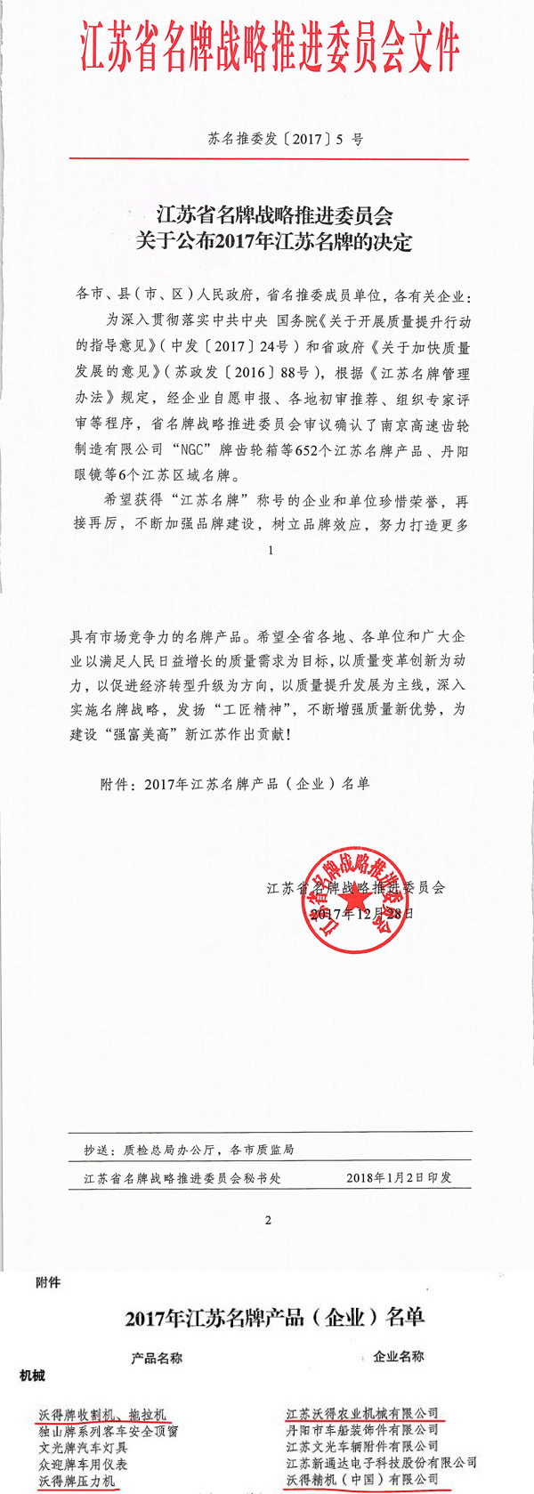 2018年1月2日,江蘇省名牌戰略推進委員會公布了江蘇省“江蘇名牌”企業名單, 我集團下屬子公司江蘇沃得農業機械有限公司生產的沃得牌收割機、拖拉機,沃得精機(中國)有限公司生產的沃得牌壓力機榮獲“江蘇名牌”產品稱號。